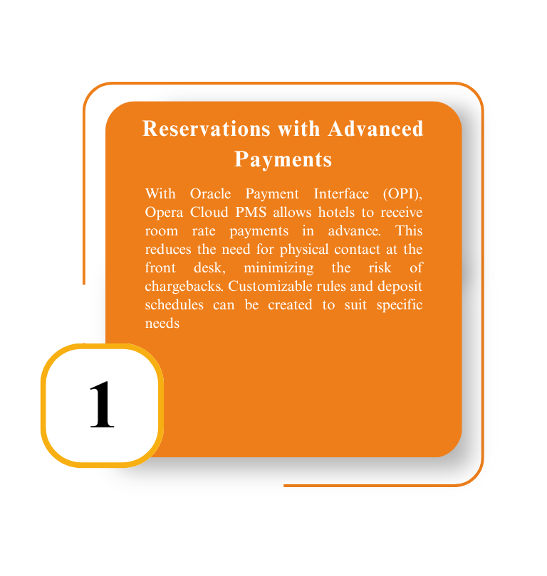 With Oracle Payment Interface (OPI), Opera Cloud PMS allows hotels to receive room rate payments in advance. This reduces the need for physical contact at the front desk, minimizing the risk of chargebacks. Customizable rules and deposit schedules can be created to suit specific needs