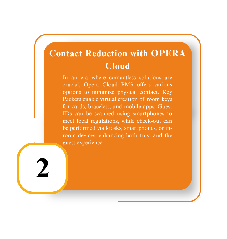 In an era where contactless solutions are crucial, Opera Cloud PMS offers various options to minimize physical contact. Key Packets enable virtual creation of room keys for cards, bracelets, and mobile apps. Guest IDs can be scanned using smartphones to meet local regulations, while check-out can be performed via kiosks, smartphones, or in-room devices, enhancing both trust and the guest experience.