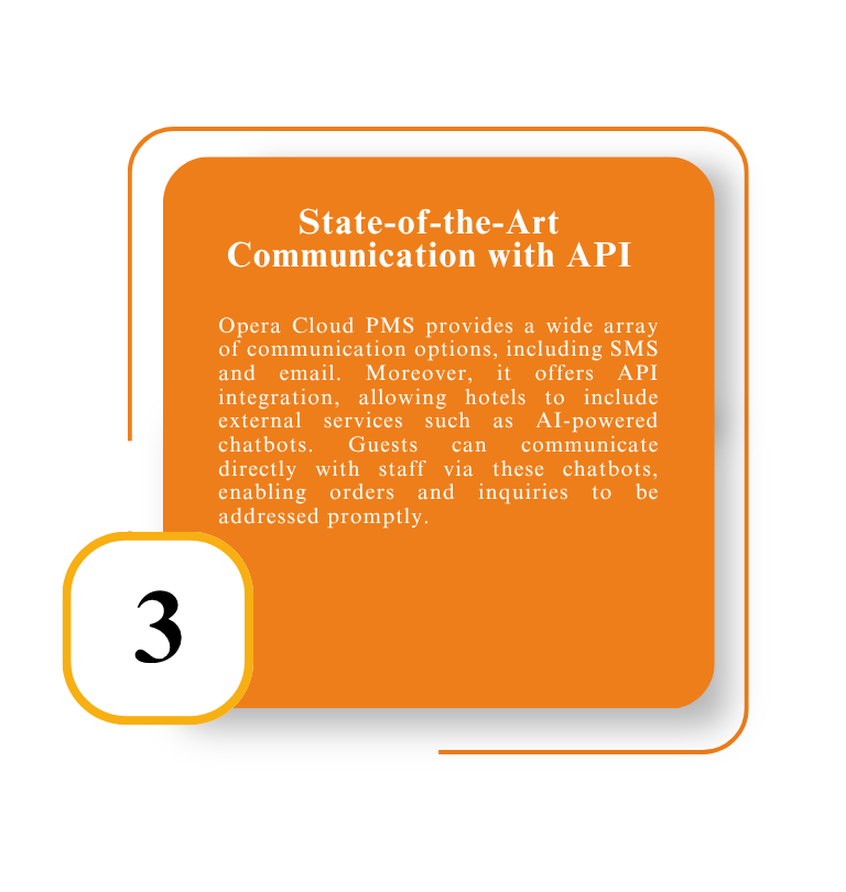 Opera Cloud PMS provides a wide array of communication options, including SMS and email. Moreover, it offers API integration, allowing hotels to include external services such as AI-powered chatbots. Guests can communicate directly with staff via these chatbots, enabling orders and inquiries to be addressed promptly.