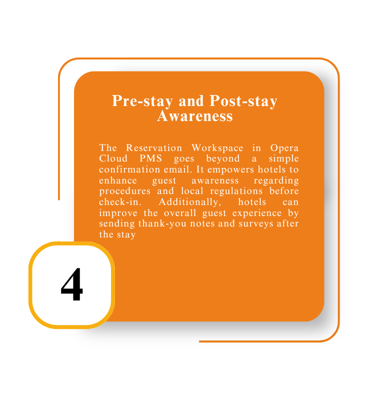The Reservation Workspace in Opera Cloud PMS goes beyond a simple confirmation email. It empowers hotels to enhance guest awareness regarding procedures and local regulations before check-in. Additionally, hotels can improve the overall guest experience by sending thank-you notes and surveys after the stay