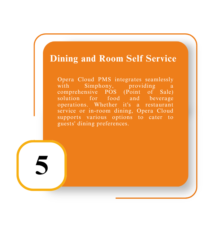 Opera Cloud PMS integrates seamlessly with Simphony, providing a comprehensive POS (Point of Sale) solution for food and beverage operations. Whether it's a restaurant service or in-room dining, Opera Cloud supports various options to cater to guests' dining preferences.